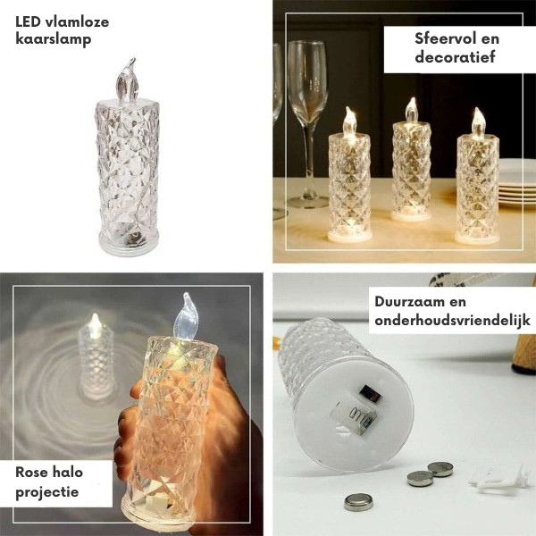 Ben je op zoek naar de perfecte manier om een romantische, ontspannen en onvergetelijke sfeer te creëren? De CrystalFlame-lamp is meer dan alleen een lamp – het is een sfeermaker. Het elegante, kristalgeslepen glas verspreidt zachte lichtgolven door de ruimte en bootst een echt kaarseffect na, zonder rook, druipend kaarsvet of brandgevaar.